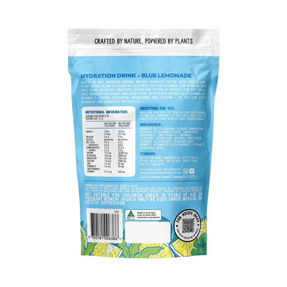 Botanika Blends Hydration Potion Hydrating Electrolyte Mix – Blue Lemonade is a clean, plant-based electrolyte powder designed to support hydration, replenish essential minerals, and enhance daily performance. This refreshing blue lemonade electrolyte drink mix features key electrolytes, zero added sugar, and a delicious natural flavour—perfect for workouts, travel, or everyday hydration support.