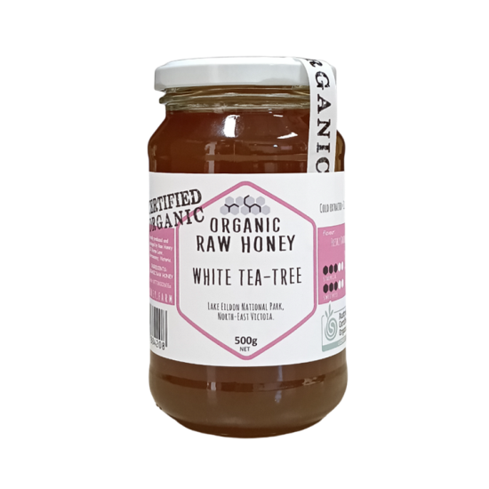 Certified organic raw honey, White Tea Tree honey Victoria, cold extracted organic honey, pure Australian raw honey – unfiltered, natural and rich in flavour.