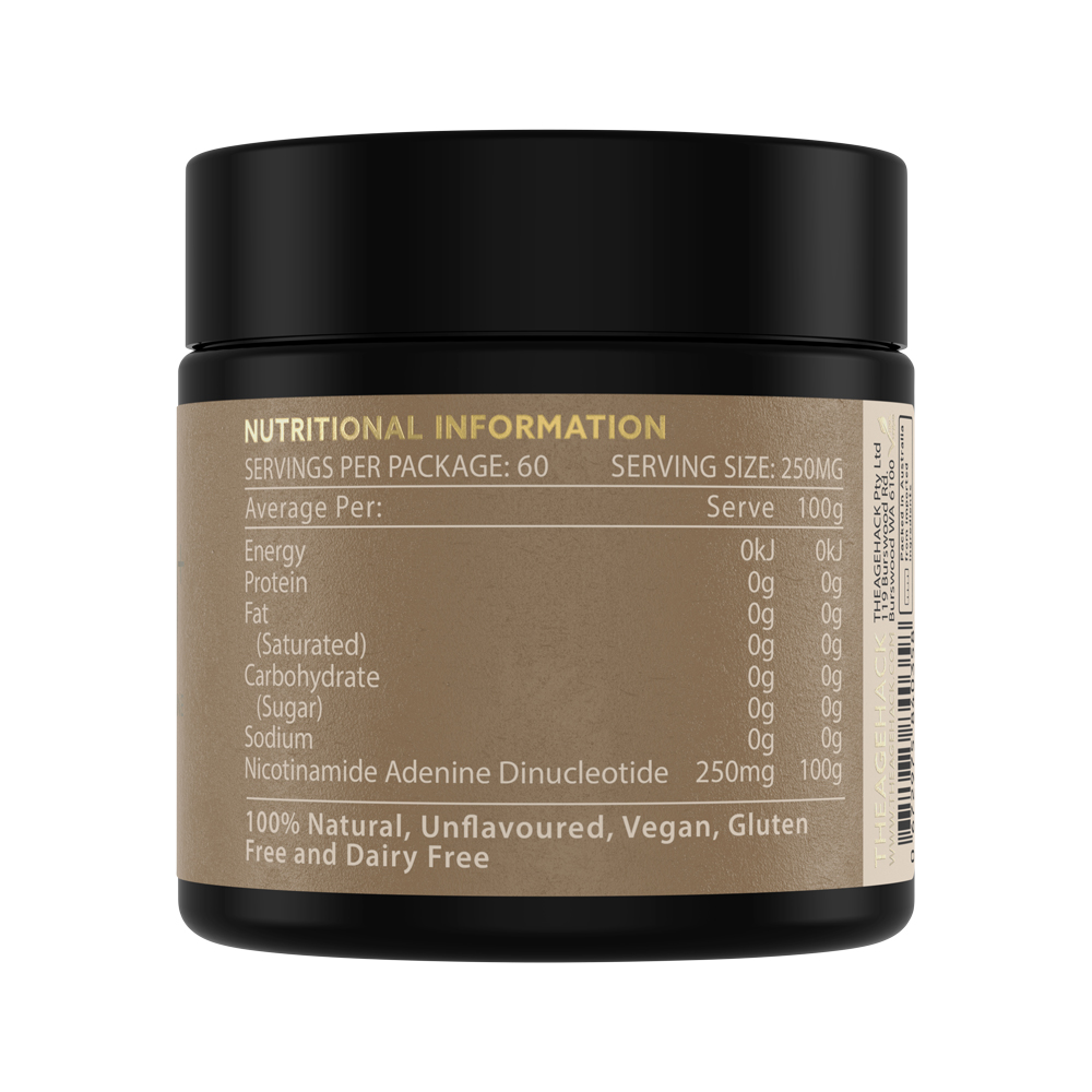 TheAgeHack NAD+ Powder is a powerful, 100% natural NAD+ supplement (Nicotinamide Adenine Dinucleotide) designed to boost cellular energy, support anti-ageing, and enhance overall wellbeing from the inside out.