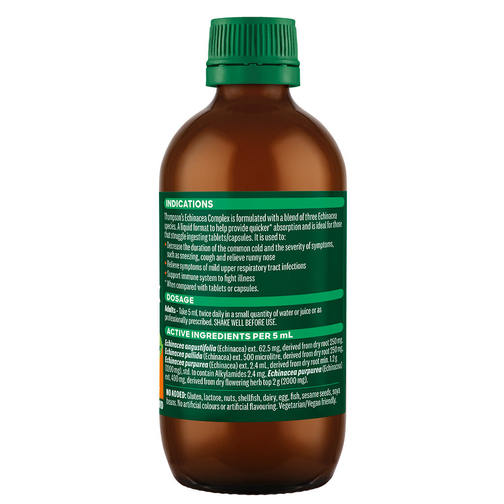 Thompson’s Echinacea Complex is a fast-absorbing liquid herbal supplement combining three Echinacea species to help relieve cold and flu symptoms, support immune system health, and reduce the duration of upper respiratory tract infections.