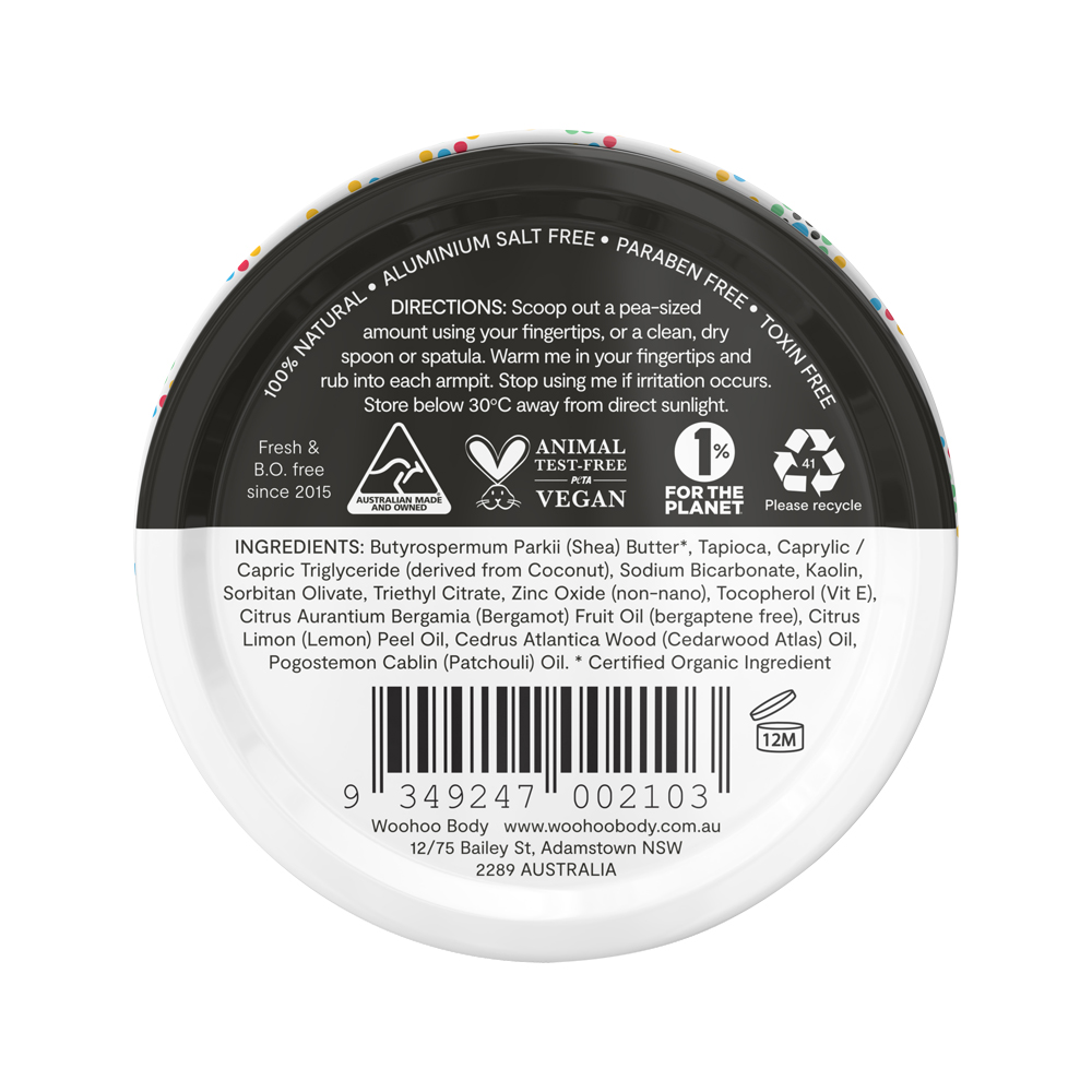 Proudly Australian made and owned, Woohoo Tux is 100% natural, vegan, toxin-free, and cruelty-free — the ultimate deodorant for anyone who wants effective odour control without compromise. The sleek 100% recyclable tinplate packaging is completely plastic-free, making it as eco-conscious as it is effective.